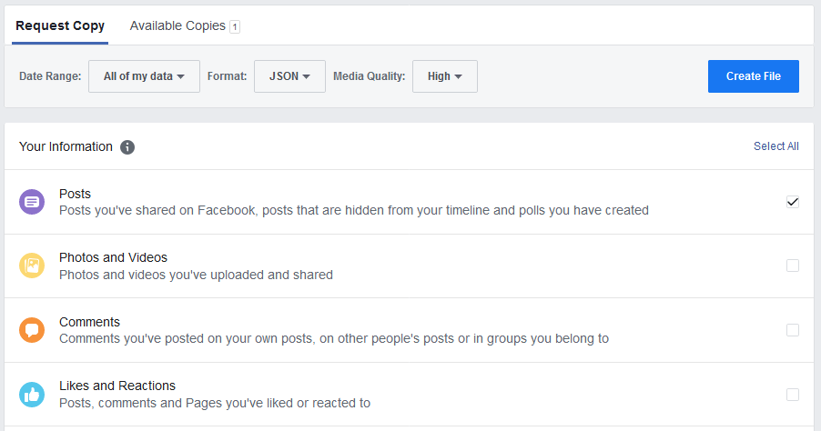 Facebook actually allows us to download pretty much everything we've ever done on the site. You can download your data here, but you may not want to download all of it — that file could be massive, depending on how often you use Facebook and how long you've been on it.