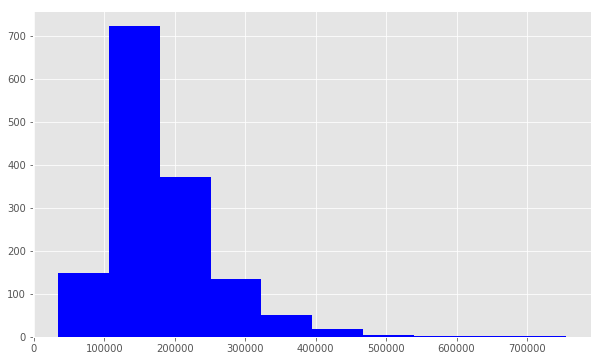 plt.hist(train.SalePrice, color='blue')
