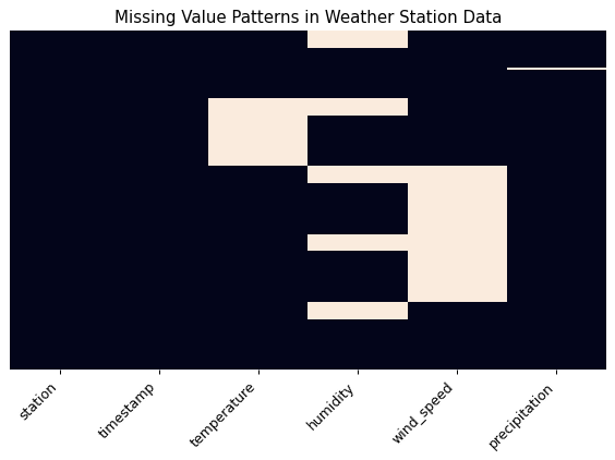Understanding these patterns is essential for choosing the right handling strategies. In my case, when I noticed that temperature readings were missing for an entire station, I realized I could use readings from nearby stations as reasonable estimates. Similarly, seeing regular patterns in missing humidity readings during early morning hours indicated a systematic data collection issue that needed to be addressed.