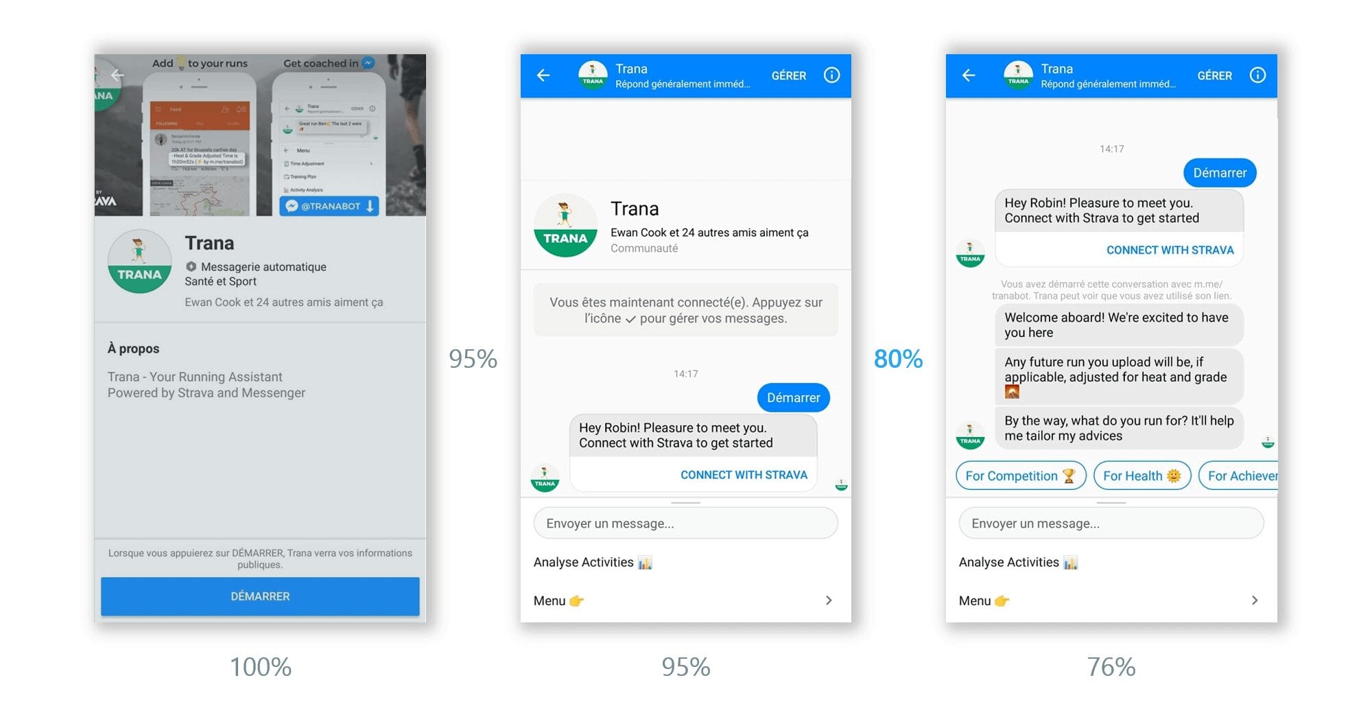 Trana is a Facebook Messenger ChatApp that provides extra running insights to its users. To do so it connects to their Strava account. Therefore, the moment at which we ask users to link their account is key. On top of this instinctive rationale, let's analyze our full onboarding funnel. This can be done in a tool such as Mixpanel after having designed a tracking plan.