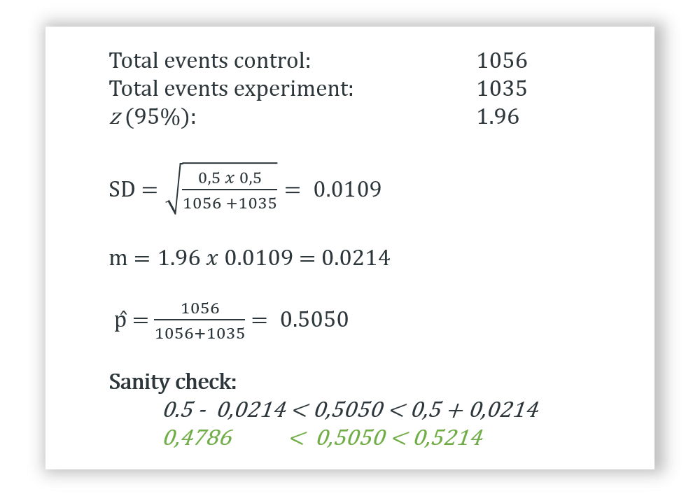 Assessing whether the experiment is outperforming the control can be a hassle. Therefore, I built a little tool to do it, plug your figures into it to perform the three checks. Below are the details of the computation. dmin is the minimum detectable effect, N is the sample size, and X the conversion count, the number of people who took the desired action.