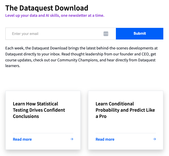 Of course, I can't leave out our own newsletter, the Dataquest Download. Each Tuesday we highlight some top news stories, pass along great career advice, and try to inspire you with cool projects and helpful learning resources. You can subscribe simply by signing up for a free Dataquest account. And of course, we've also got our blog, which is another great free learning resource. Here are a few of our favorite and most read posts: