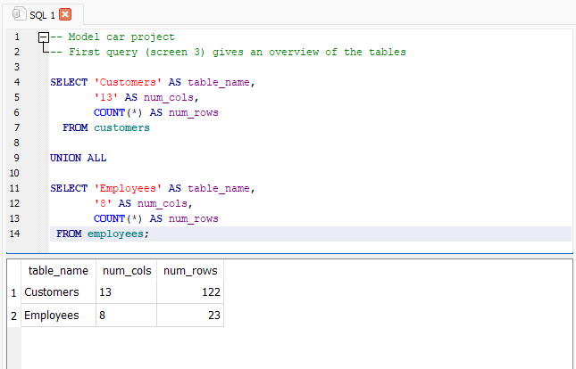 Let’s summarize all tables in one query using UNION ALL. It’s a powerful way to combine results across tables. Here we can see the query and output for the first two tables in the database (customers and employees):
