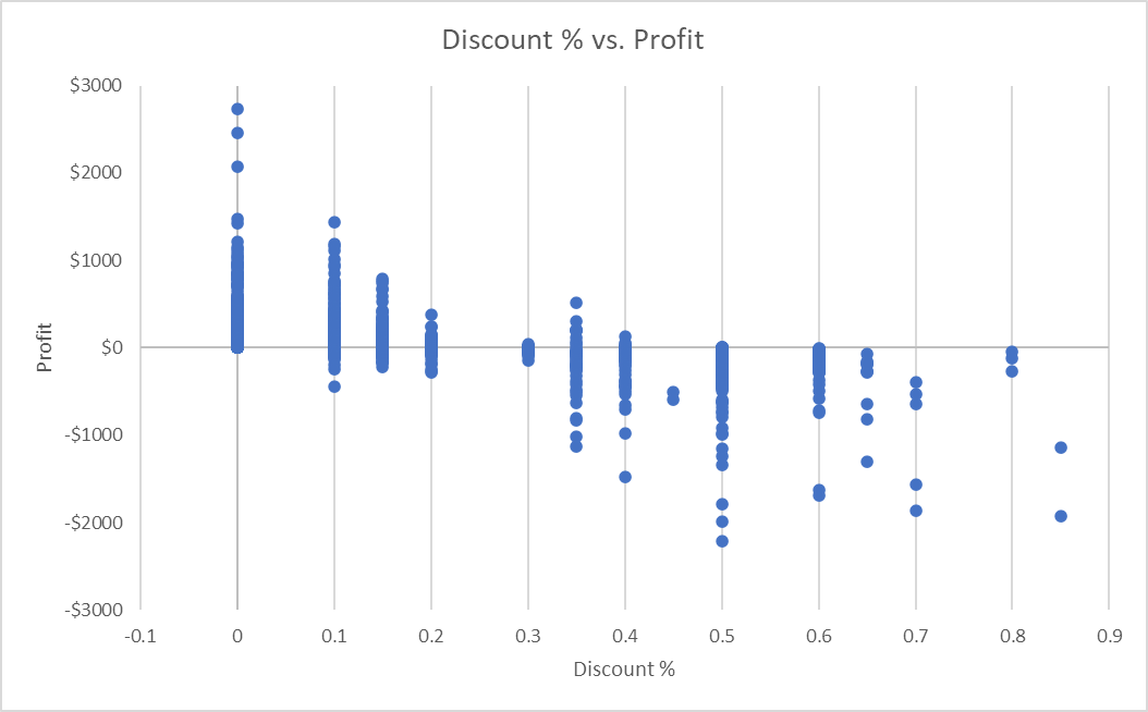 In this example, the scatter plot reveals something interesting. We see that discounts of 15% or lower maintain decent profit margins, whereas higher discounts often dip into negative territory.