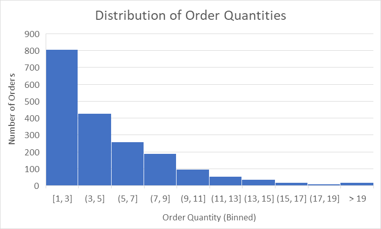 We’re looking at data on order quantities and ask ourselves, "What's the typical size of customer orders?" A histogram immediately shows that most orders contain between one and five items. This insight helps us with inventory planning: if most orders are small, stocking large bundles might not be the best strategy.