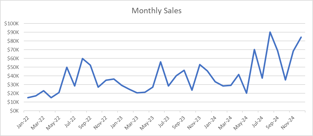 We’re examining monthly sales data over several years and ask ourselves, “What are the trends in sales over time?” A line chart immediately reveals trends, such as periods of consistent growth or seasonal peaks and valleys. Our audience can quickly understand how sales performance has evolved, allowing us to discuss future strategies based on clearly visible patterns.