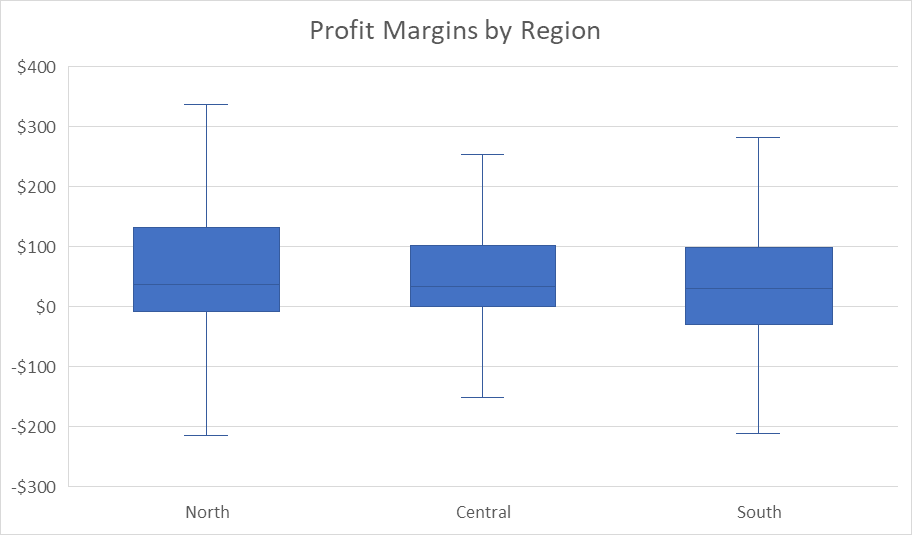 Our question is: “Do profit margins vary significantly by region, and which region has the widest spread?” Because this question focuses on comparing the distribution of a numeric variable across groups, a box plot is an ideal choice. When we look at the chart, we see that the North has profit margins ranging from around –\$200 to \$350, with a median near \$50. Central is more tightly clustered around its median, and the South shows a moderate range, with dips below zero. These differences help us identify variation, spot potential outliers, and decide where to investigate further.