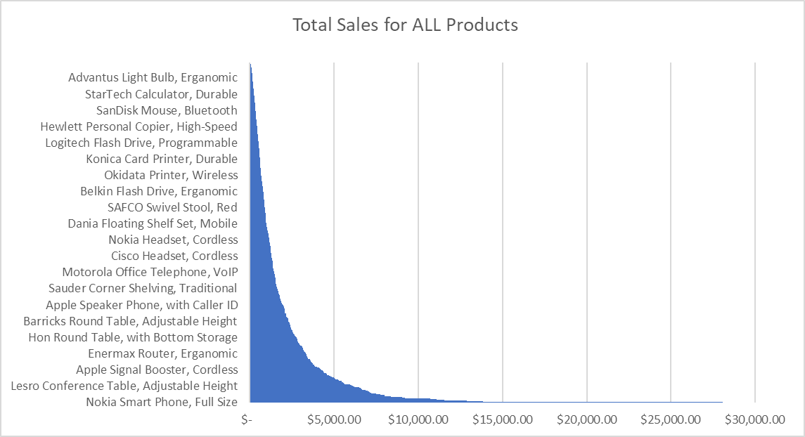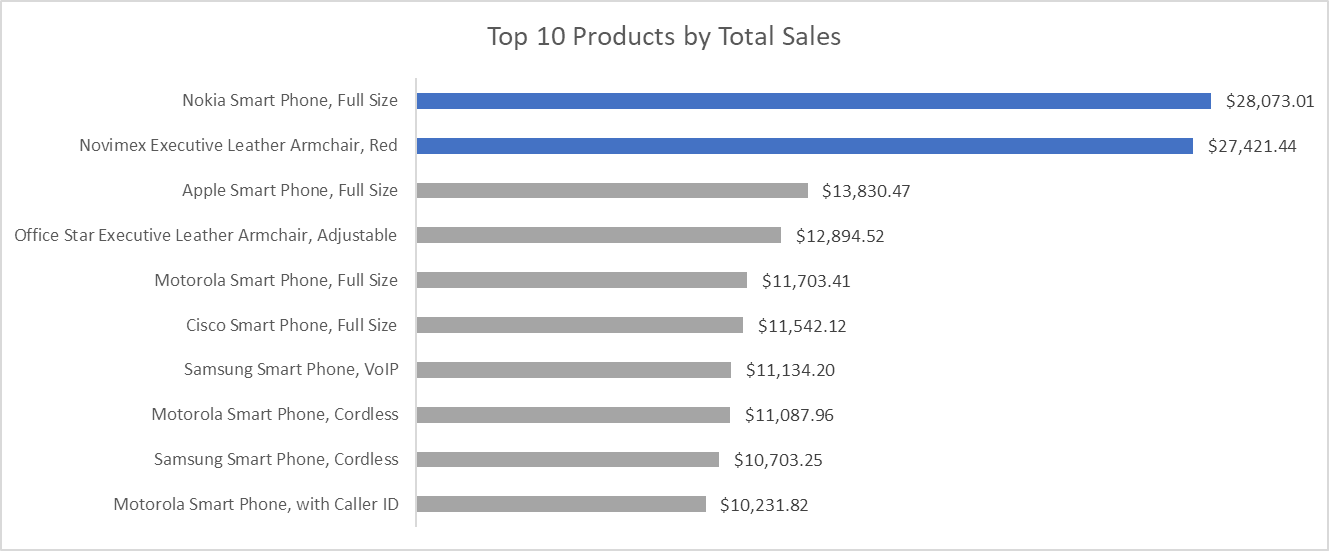 In the example below, the bars become difficult to interpret because too many categories are squeezed into the chart. The Nokia Smart Phone and the Novimex Armchair are technically the best performers, but their labels are lost in the visual noise, making it harder to draw meaningful conclusions.