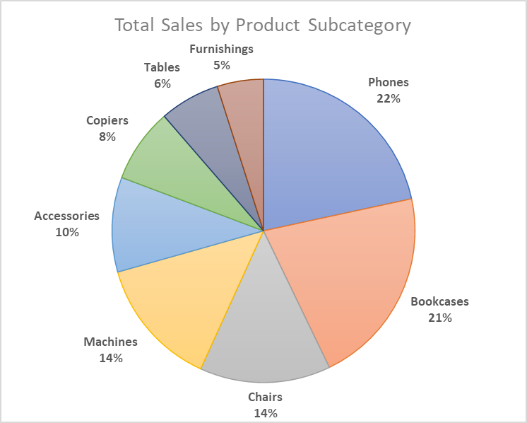 If we ask, "What proportion of total sales comes from each product category?" a pie chart effectively illustrates that categories such as phones, chairs, and bookcases dominate overall sales. The proportions are immediately clear and intuitive. We can see that phones and bookcases make up nearly half of all sales, while subcategories like tables and furnishings account for a much smaller proportion.
