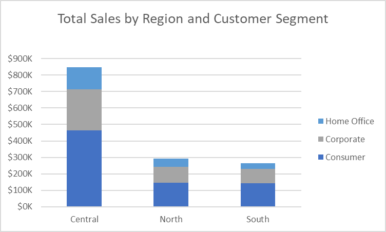 We might use a stacked bar chart to answer, "How do sales vary by region and customer segment?" This visual clearly demonstrates how regions differ and how each customer segment contributes to regional sales totals. It provides an immediate sense of proportion, highlighting the segments driving overall sales performance. At a glance we can see that the Central region drives the most sales and that the Consumer segment accounts for the largest proportion of sales for every region.