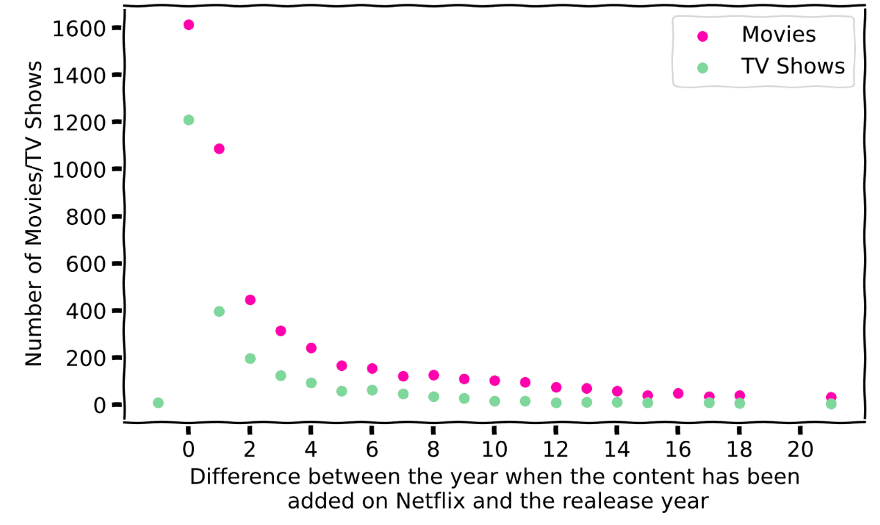 As you can see in the visualization above, the majority of the content on Netflix has been added within a year of its release date. So, Netflix does have the latest content most of the time!