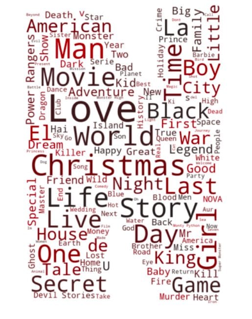 Do you see Christmas right at the center of this word cloud? Seems like there is an abundance of Christmas movies on Netflix. Other popular words are Love, World, Man, Life, Story, Live, Secret, Girl, Boy, American, Game, Night, Last, Time, and Day.