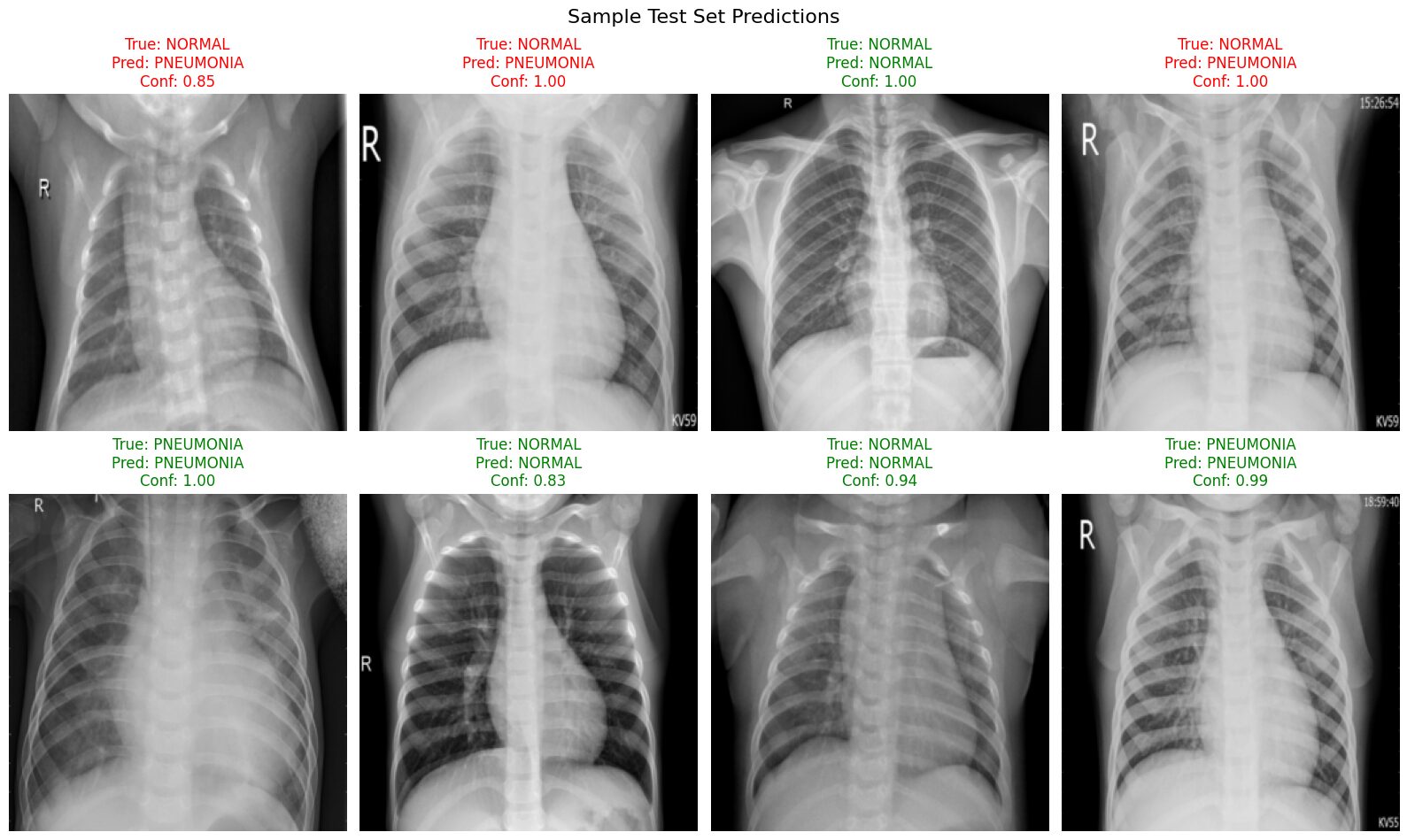 This specific misclassification provides a clear example of the main weakness identified in our evaluation metrics: the model's difficulty in correctly recognizing NORMAL cases (achieving only ~38.0% recall/specificity according to the Classification Report). Errors like this, where NORMAL images are falsely predicted as PNEUMONIA (False Positives), are why the overall Precision for the PNEUMONIA class was limited to ~72.8%. ****When the model predicts PNEUMONIA, roughly 27% of those predictions are actually NORMAL cases being misclassified.