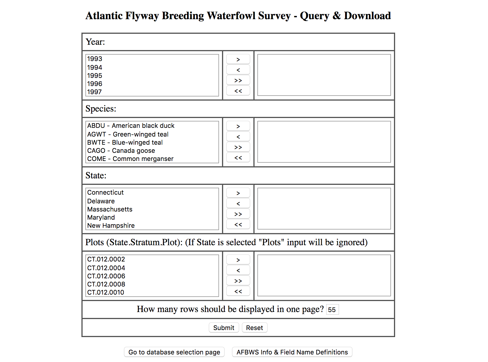 Committed to the data set of waterfowls flyway patterns, we decide to follow another link path to USFWS reports. These reports are described as survey data about the flyway pattern of North American waterfowls from 1995; exactly what we were looking for. Once we click on the link to the reports, we are greeted with a terms of service and disclaimer blocker. After accepting it, there is a report generation form that gives researchers the ability to restrict data on the types of waterfowls, state, or "plot" that the fowl was spotted in.
