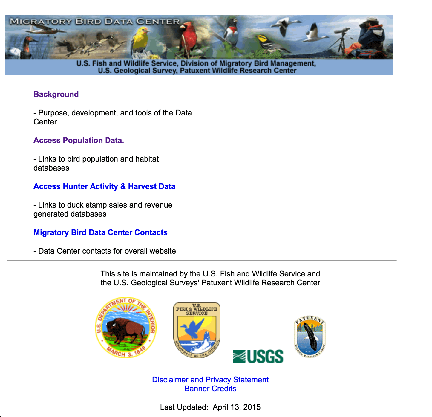 Unfortunately, retrieving the data from the USFWS portal is not easy. There are multiple dead links, poorly formatted data sets, and HTML buttons that don't work as advertised. While these issues are mostly poor interface design, all the HTTP endpoints seem to work, and with a little bit of Python code, we'll find that we're able to get the data we need.