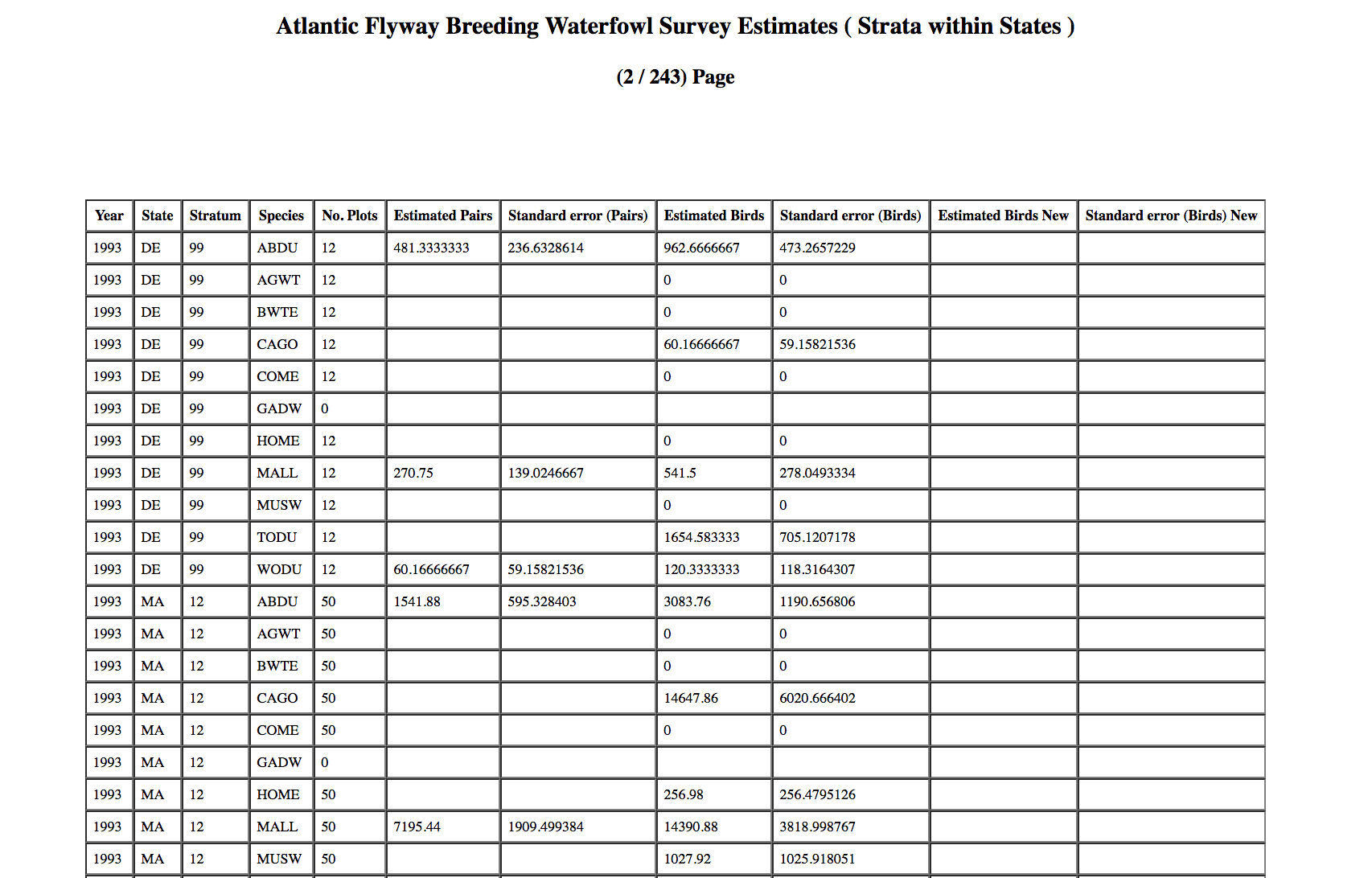 Due to the vast amount of links the USFWS site provides, it's difficult just to find possible data set endpoints. When we dive in, the first successful data set we find is by following links to the USFWS published databook of waterfowl flyway patterns. The databook supposedly contains all the information we need for our investigation, but there is a major flaw: it is stored as a PDF. It's difficult to parse PDFs due to their inconsistent structure, so this should be a last resort.