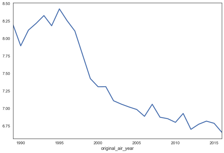 We can use the original_air_date column to look at how episodes have trended over time. First, let's extract the year from that column and then use pivot tables to visualize how IMDB ratings have trended over time: