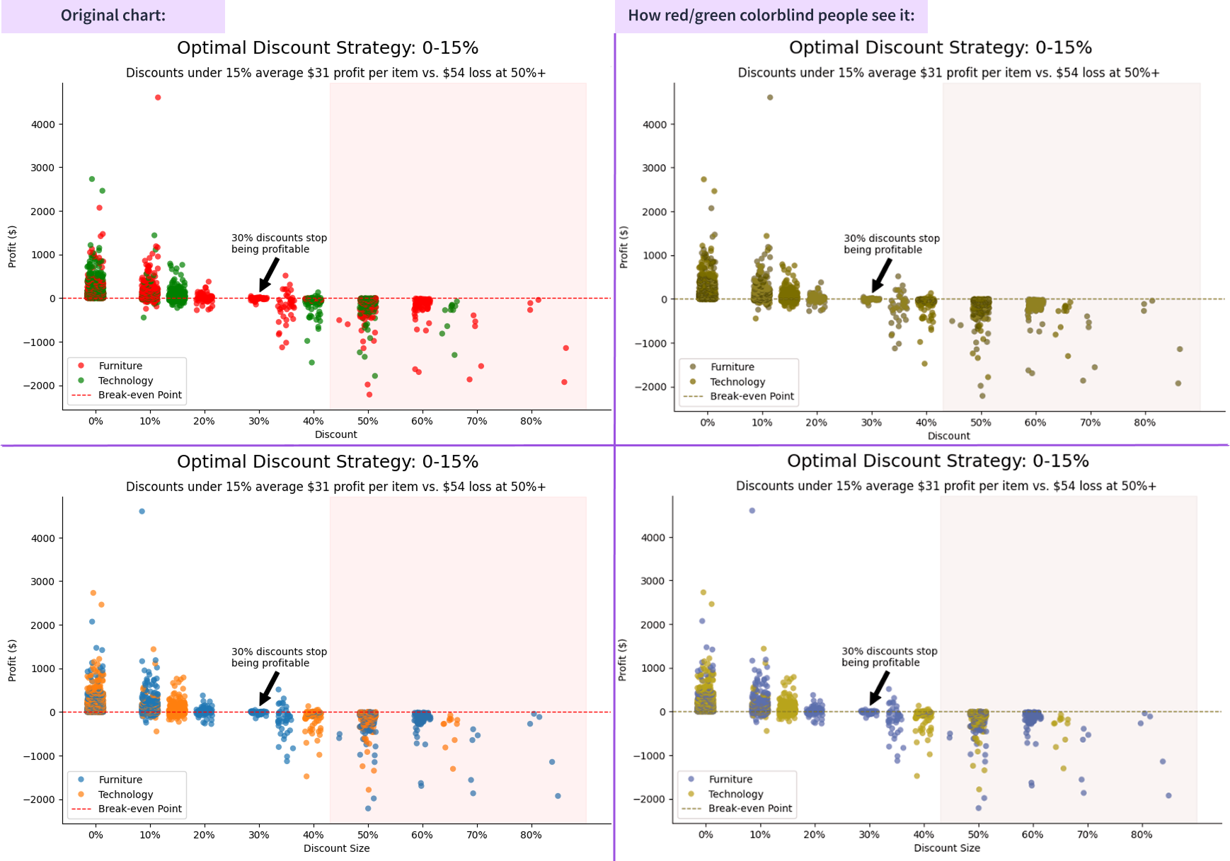 For our Superstore visualization, we might choose a blue-orange contrast rather than red-green, ensuring all viewers can distinguish between positive and negative values. In the image demonstration below, we can see that a red-green color palette is indistinguishable to a red-green colorblind viewer, whereas an orange-blue color palette still shows a high-contrast distinction between product types.