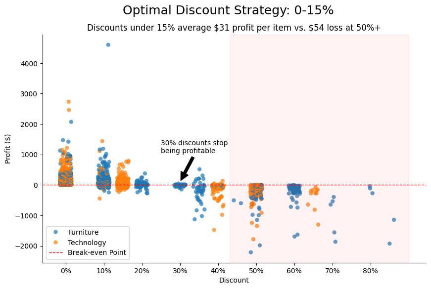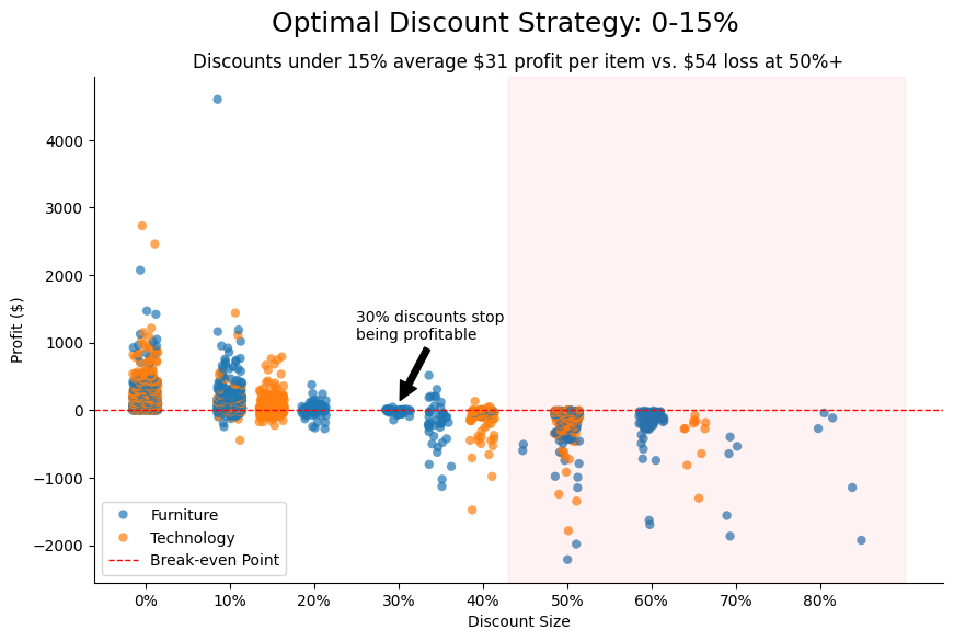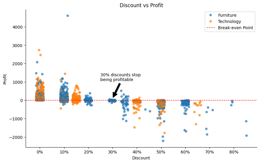 Discountmark to clarify that this represents the percentage that stops being consistently profitable for the company - “Break-even Point” in the legend box to further clarify the horizontal line at zero profit