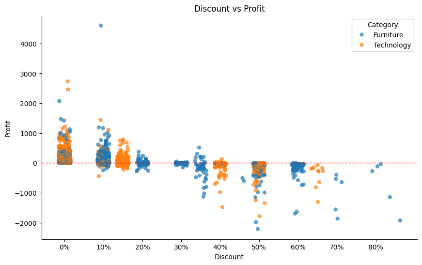 A clearer purpose would be: "Show how increased discount amounts negatively affect profit for both major product categories, suggesting which discount values are unprofitable for the company."