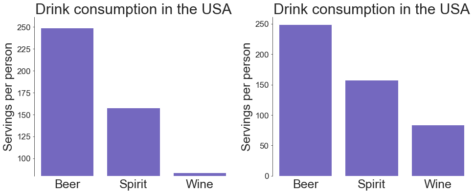 The plot on the left gives us a misleading impression that the consumption of wine in the USA is around 15 times lower than that of spirit, which, in turn, is less than half that of beer. On the right plot, we see completely different proportions, which are the correct ones.