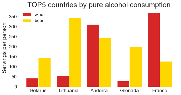 plt.title('TOP5 countries by pure alcohol consumption', fontsize=25)