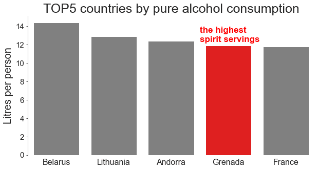 However, we still can emphasize some bars in particular and display the other ones in grey. For example, of our TOP5 countries above, let’s highlight the leader in drinking specifically spirits. Besides color emphasizing, we’ll add also a corresponding annotation: