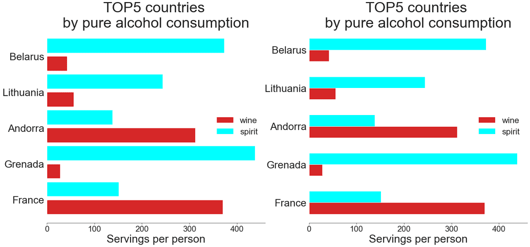 Let’s compare the two bar plots below, which are identical in terms of the data but different in style. Also, we’ll find out which countries consumed the most alcohol in 2010: