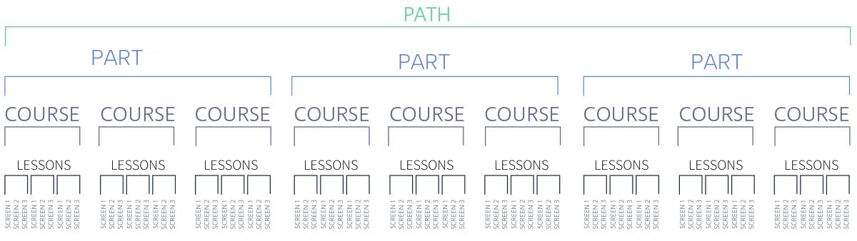 Dataquest’s learning content is broken into (in order of largest to smallest) paths, parts, courses, lessons (and guided projects), and screens.