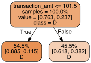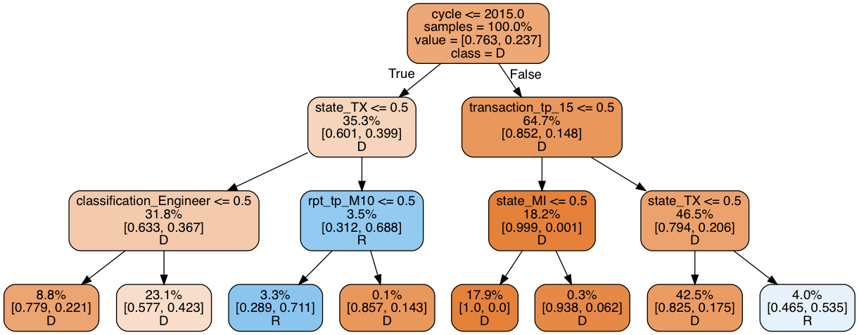 Each of the two leaves register their share of training samples, the class distribution within their share, and the class label prediction. Our decision tree bases its prediction on whether the size of the contribution is above 101.5: but it makes the same prediction regardless! This is not too surprising given that 75% of all donations are to Democrats. But it's not making use of the data we have. Let's use three levels of decision rules and see what we can get: