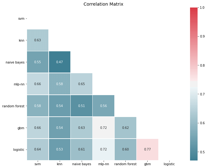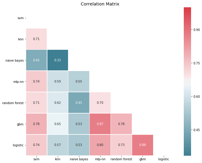 Returning to our prediction problem, let's see if we can build an ensemble out of our two decision trees. We first check error correlation: highly correlated errors makes for poor ensembles.