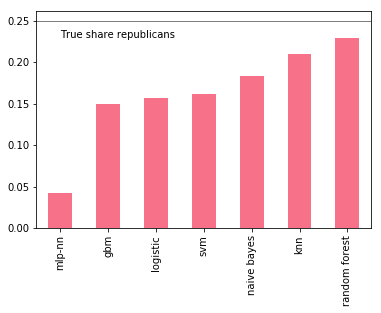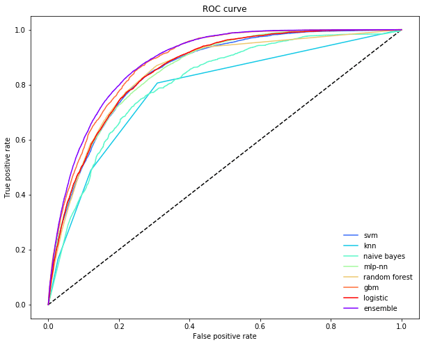 The upshot is that you should use a unit-tested package and focus on building your machine learning pipeline. In fact, once you've settled on an ensemble package, building ensembles become really easy: all you need to do is specify the base learners, the meta learner, and a method for training the ensemble. Fortuntately, there are many packages available in all popular programming languages, though they come in different flavors. At the end of this post, we list some as reference. For now, let's pick one and see how a stacked ensemble does on our political contributions data set. Here, we use ML-Ensemble and build our previous generalized ensemble, but now using 10-fold cross-validation:
