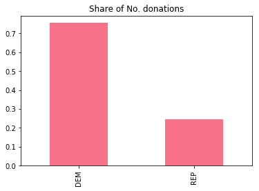 The figure above is the data underlying Ben's claim. Indeed, between Democrats and Republicans, about 75% of all contributions are made to democrats. Let's go through the features at our disposal. We have data about the donor, the transaction, and the recipient: To measure how well our models perform, we use the ROC-AUC score, which trades off having high precision and high recall (if these concepts are new to you, see the Wikipedia entry on precision and recall for a quick introduction). If you haven't used this metric before, a random guess has a score of 0.5 and perfect recall and precision yields 1.0.