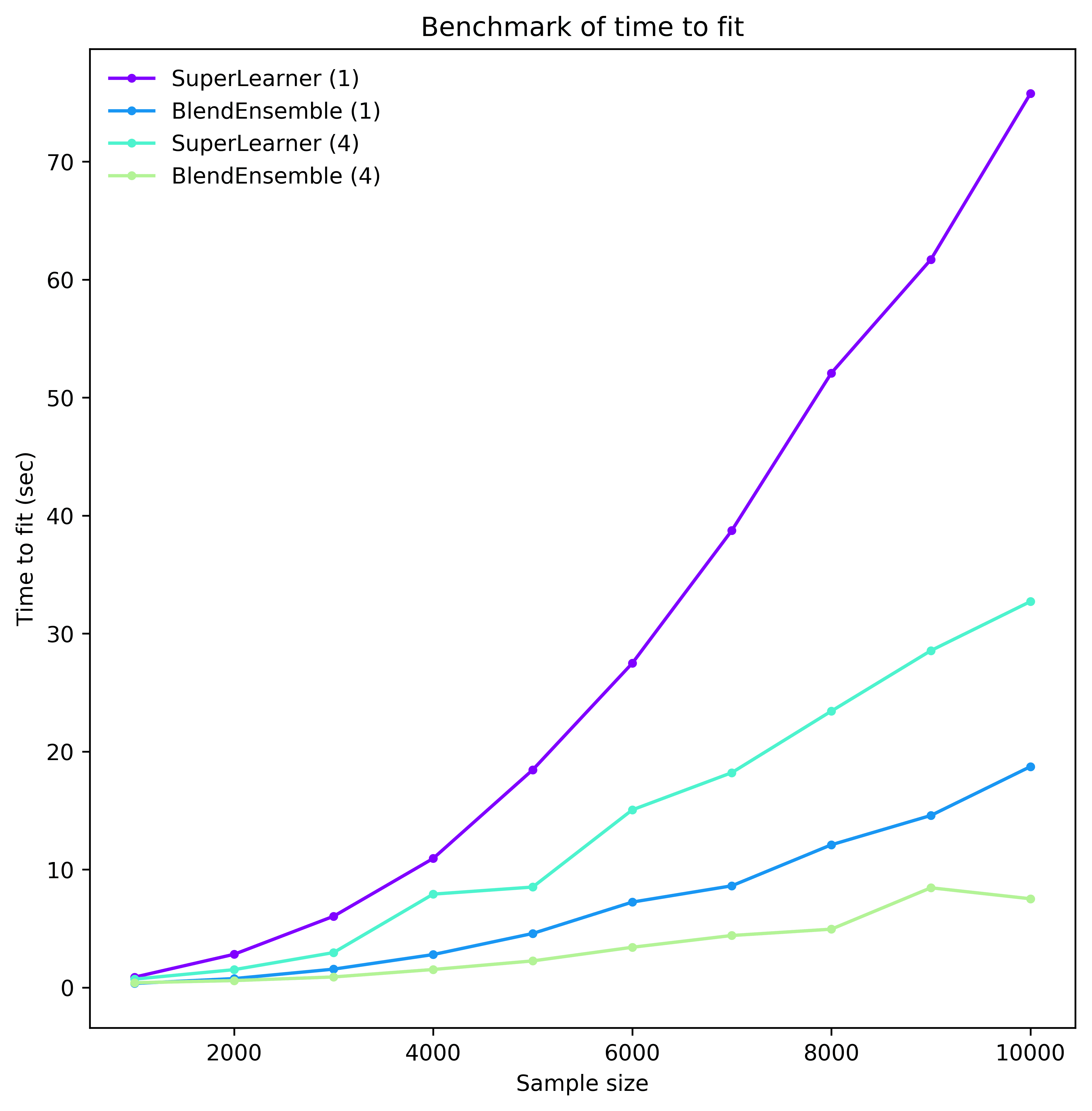 Suppose we want to use 10 folds for stacking. This would require training all base learners 10 times on 90% of the data, and once on all data. With 4 base learners, the ensemble would roughly be 40 times slower than using the best base learner. But each cv-fit is independent, so we don't need to fit models sequentially. If we could fit all folds in parallel, the ensemble would only be roughly 4 times slower than the best base learner, a dramatic improvement. Ensembles are prime candidates for parallelization, and it is critical to leverage this capability to the greatest extent possible. Fitting all folds for all models in parallel, the time penalty for the ensemble would be negligible. To hone this point in, below is a benchmark from ML-Ensemble that shows the time it takes to fit an ensemble via stacking or blending either sequentially or in parallel on 4 threads.