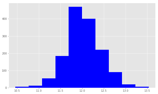 plt.hist(train.SalePrice, color='blue')