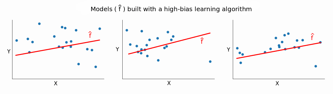 The reverse also holds: the greater the bias, the lower the variance. A high-bias method builds simplistic models that generally don't fit well training data. As we change training sets, the models \(\hat{f}\) we get from a high-bias algorithm are, generally, not very different from one another.