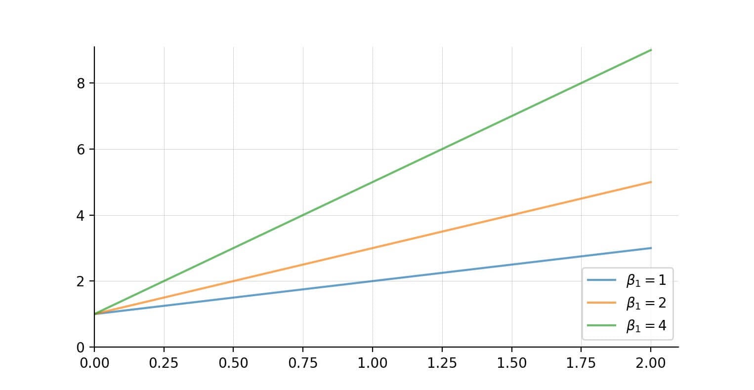Different coefficient values for the linear model: y = 1 + Beta1x