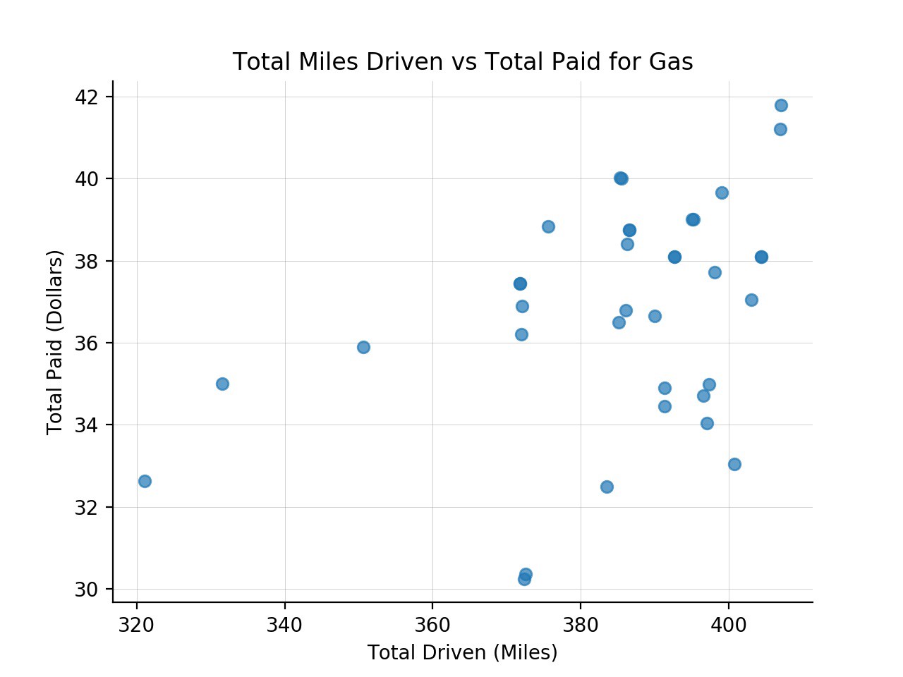 Clearly there is a linear relationship between miles driven and total paid for gas. Because this relationship is linear, if you spend less/more money — e.g. half vs full tank — you'll be able to drive fewer/more miles.
