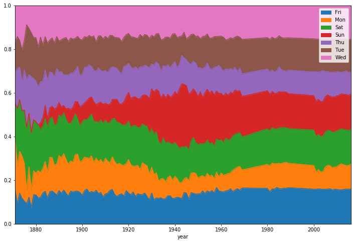 We can also see pretty clearly that the distribution of game days has been relatively static for the last 50 years.