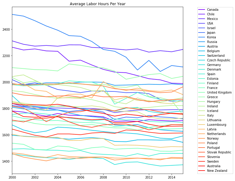After some observation, we find that rows are countries, columns are years, and cell values are the average annual hours worked per employee. As glorious as DataFrames are, they are still pretty hard to understand at a glance, so we're going to do some plotting using matplotlib's DataFrame.plot() method to create line graphs for our yearly labor trends.