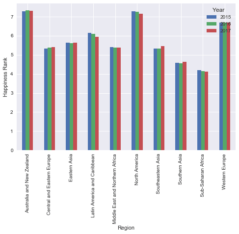 The numbers displayed in the Happiness Score column in the pivot table above are the mean, just as before - but this time it's each region's mean for all years documented (2015, 2016, 2017). This display makes it easier to see Australia and New Zealand have the highest average score, while North America is ranked close behind. It's interesting that despite the initial impression we got from reading the data, which showed Western Europe in most of the top places, Western Europe is actually ranked third when calculating the average for the past three years. The lowest ranked region is Sub-Saharan Africa, and close behind is Southern Asia.