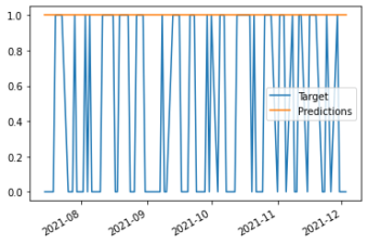 We can do this by plotting the target against the predictions. We do this by first combining the Then, we can plot the DataFrame to visualize both columns. As we can see, the model predicted that the price would go up every single day. This is not ideal, but we've setup the model, and can now move on to backtesting. <AxesSubplot:> Our model isn't great, but luckily we can still improve it. Before we do that, let's figure out how to make predictions across the entire dataset, not just the last 100 rows. This will give us a more robust error estimate. The last 100 days may have had atypical market conditions or other issues that make error metrics on those days unrealistic for future predictions (which are what we really care about). You wouldn't want to use an algorithm for anything in the real world if you only had 100 days of data to test it on. To test on more days, we'll need to backtest. Backtesting ensures that we only use data from before the day that we're predicting. If we use data from after the day we're predicting, the algorithm is unrealistic (in the real world, you won't be able to use future data to predict that past!). Our backtesting method will loop over the dataset, and train a model every Before we write our full backtesting loop, let's write the code for a single iteration. In the below code: This is similar to what we did before, but we changed which rows we're looking at: Next, let's add a little bit more precision. We're using the predict method to generate predictions. However, this method doesn't optimize for By default, if the model thinks there is a 50