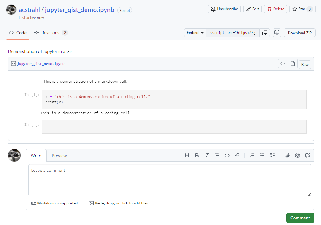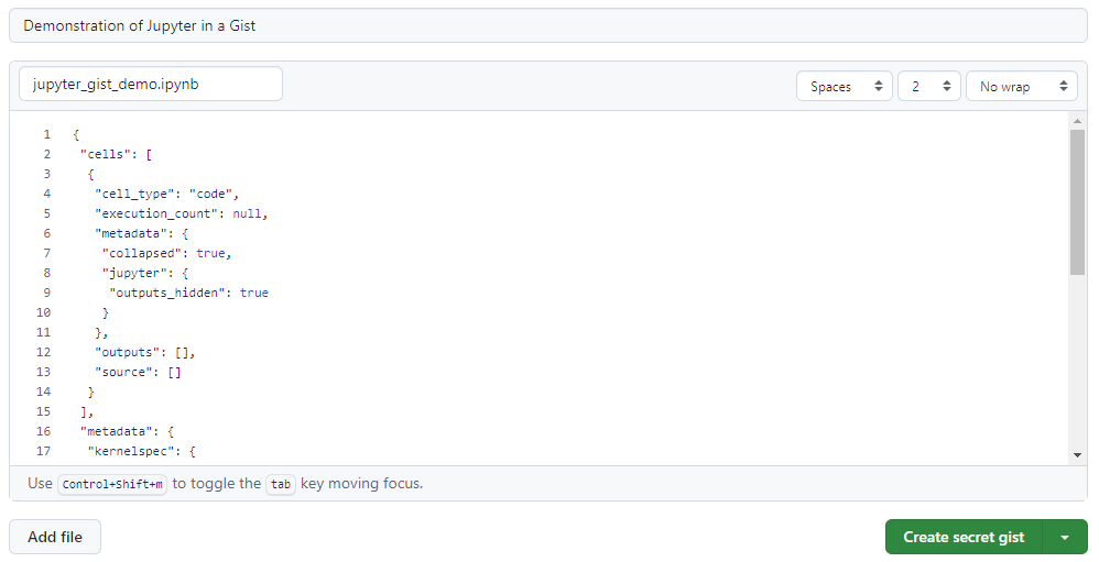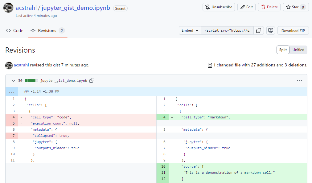 Sharing code files can be tricky if you’ve never done it before. For example, if you open a Jupyter notebook file directly on your computer without having Jupyter installed, you’ll see a bunch of raw text and JSON-like formatting instead of nice, clean renderings of your code and visualizations. This is where Gists can come in. They automatically render .ipynb files online so anyone with the link can view your code cells, plots, and analyses just like you see them online or in your local coding environment. What’s more, Gists let you track different versions of your work, so you can update your project if you receive feedback or discover a typo.