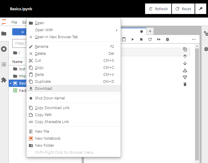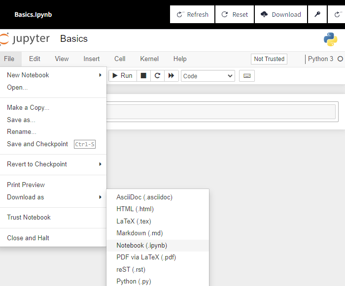 If your project lives on Dataquest’s platform or another online space, you’ll need to download it. You can do this by locating your notebook in the interface and then selecting the file. Look for an option to download, often found either in a menu or by right-clicking on the file’s name. After downloading, rename the file to something descriptive, like nyc_school_data_demo.ipynb. This helps you remember which project it is, especially if you plan on sharing multiple projects. Below are examples of downloading may look like for both common versions of Jupyter: Jupyter Notebook and Jupyter Lab.