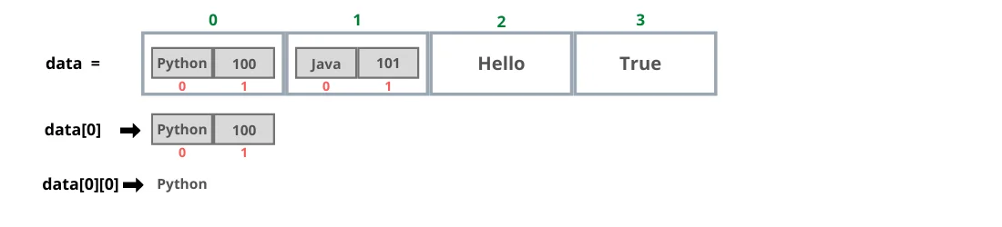 data = [["Python", 100], ["Java", 101], "Hello", True]