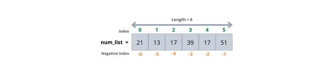 Run the code; it outputs eggs and 7.90. The first value is eggs because it is the first item in the shopping list with index 0, and the second value is 7.90 because it is the third item in the price list with index 2. The following illustration represents a list with six integer elements and their indices starting from zero. It's also nice to know that Python supports negative indexing, which means the last element’s index is -1, the second to last element’s index is -2, and the k-th last element’s index is -k.