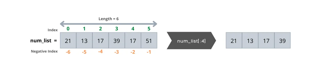Omitting the starting index means that the slice contains the list elements from the beginning of the list up to the ending index. Let’s try the code: