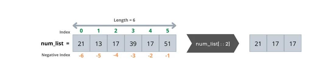We can use a step to return items at specified intervals. The step is optional — by default, it is 1. The following code returns every other item of num_list.