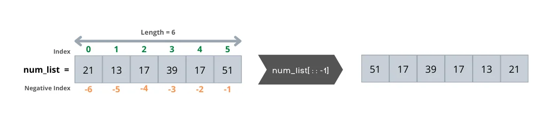 We can reverse a list by specifying the step as -1. The following code returns the num_list items in reverse order.