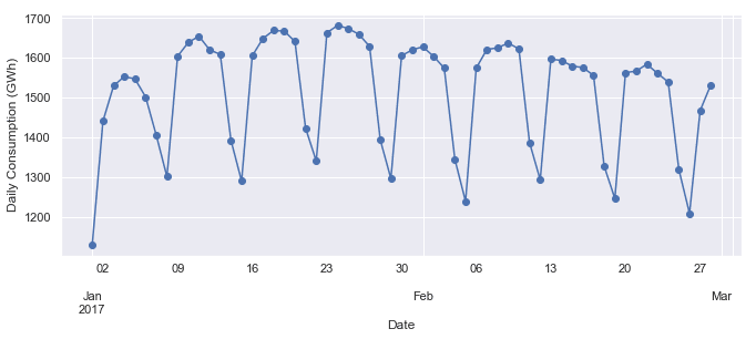 Electricity production and consumption are reported as daily totals in gigawatt-hours (GWh). The columns of the data file are: